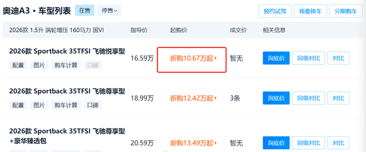 有成都那边的经销商,将 奥迪 A3(参数|询价) 的价格,调到 10.67 万起;