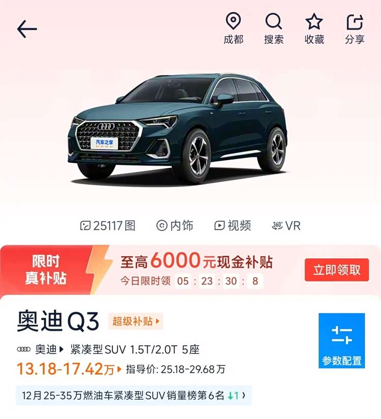 还有奥迪 Q3 ,原来 25.18-29.68 万左右的定价,现在那边有经销商直接 13.18 万元起;