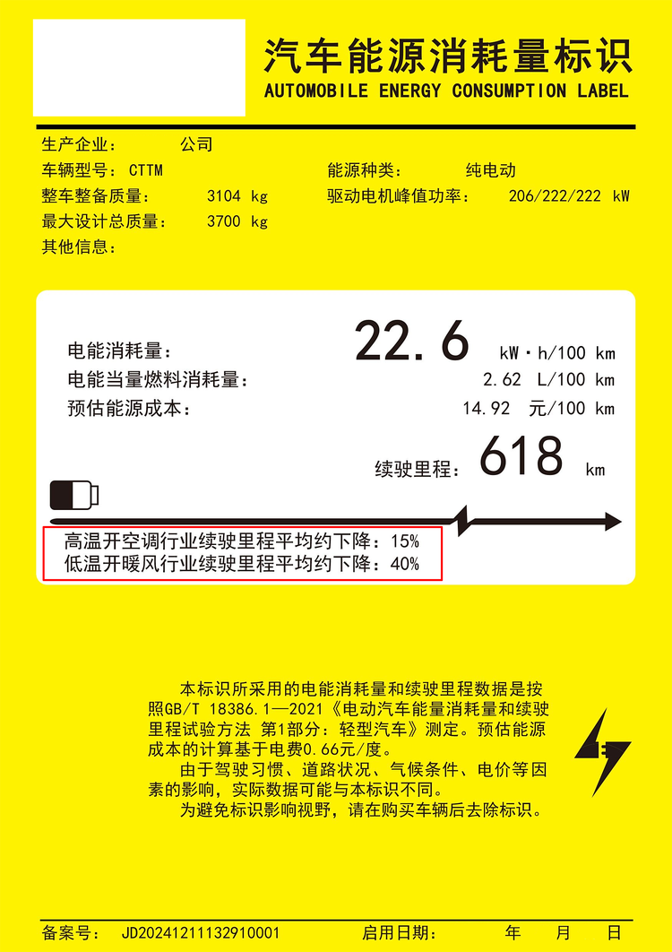 CLTC工况续航里程假设为500公里,但其只是测试数值;该测试工况里的高速行驶里程占比很低,且测试环境温度适中,是不考虑使用空调和暖风的。反之,真实的高速公路行驶车速整体偏高,其会造成续航里程大约三分之一的缩减;而汽车暖风系统耗电量是相当大的,是按照行驶时间计算的,其会导致平均40%的续航里程缩减。