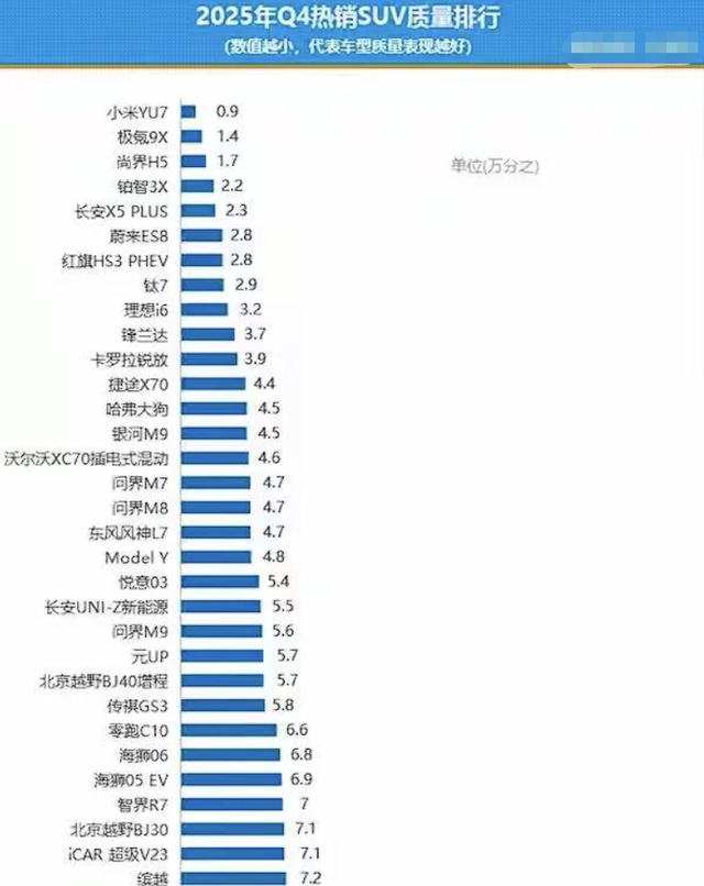 2025年四季度国内SUV市场质量表现整体回暖,根据车质网数据显示,当期热销SUV质量投诉销量比均值为万分之24.8,较三季度显著回落,其中71款车型表现优于行业均值,而榜单前十的车型更是凭借扎实的品控实力脱颖而出,接下来我们就来看看这十款车型的表现。