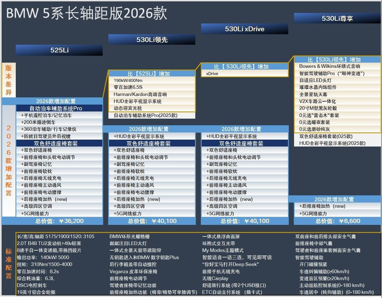 新车主要针对配置进行升级,将新增标配双色舒适座椅套装,包括双色舒适座椅、前排座椅/头枕电动调节、前排座椅软枕/通风/电动腰撑、副驾座椅记忆、后排座椅加热+无线充电、四区空调等功能;同时还将新增标配智能泊车辅助系统Pro,包括360°泊车辅助/行车记录仪、手机遥控泊车/记忆泊车、200米循迹倒车、防眩目驾驶员外后视镜等。而530Li车型还将标配HUD抬头显示。