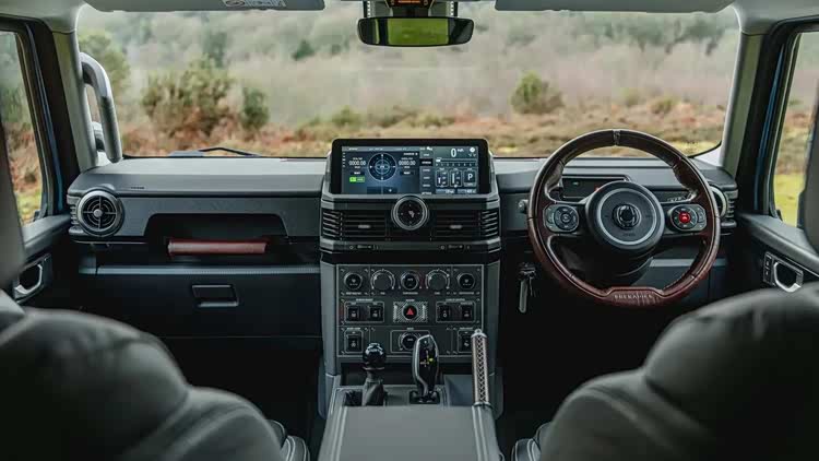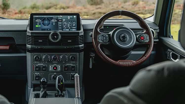 而在车尾部分,全尺寸背书包式备胎,裸露的悬梯等元素,也都非常的硬朗,对开门式的布局增强了实用性,较大的离去角,厚实的后保险杠与车头形成对应,双出排气清晰可见。而圆形的尾灯让整车套风格形成统一。在内饰部分,当然也是复古的设计,悬浮式液晶屏尺寸不大。但已经是唯一的交互元素,并没有传统的仪表盘,取而代之的是简单的警示灯面板,两幅方向盘造型可能是最时尚的元素,其他的都是硬桥硬马的硬塑料,大量的实体按键充满了机械风,以及那个一眼就能认出的宝马鸡腿式挡把,也彰显了该车的身份,是采用了宝马技术打造。