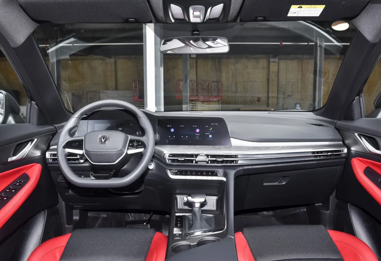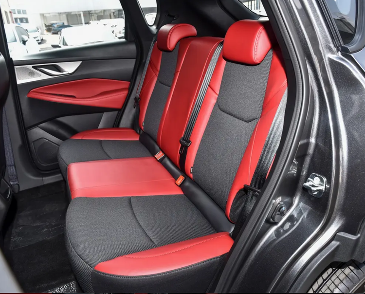 来到内饰,相比低配版本,中配版本配置更多,外部也有细微调整,比如增加一些黑化套件,增加黑色行李架和黑色后视镜,以及电动天窗,包括轮毂也会大一号。入门级没有巡航功能,但中配就有定速巡航、胎压监测、电子驻车、上坡辅助等功能。这个价位的车型都用仿皮材质,质感还可以接受,包括内饰布局和设计都很运动,细节上也有红色元素加持,进一步增强内饰的运动属性。并保留有实体按键和电子档把,多功能方向盘也有,10.25英寸双联屏搭载in Call系统,也能支持4G模块和Carlink,部分功能也可以通过语音唤醒设置。