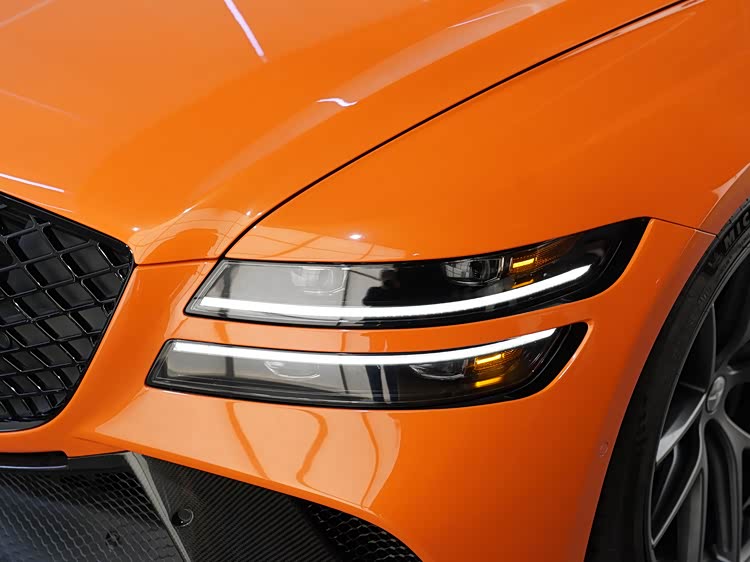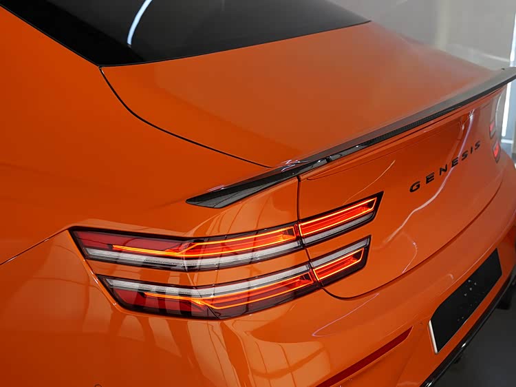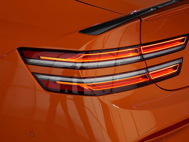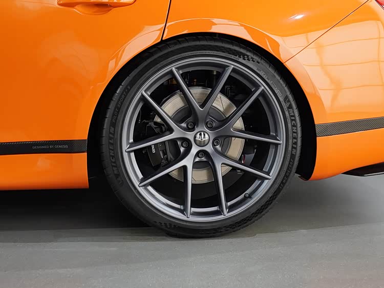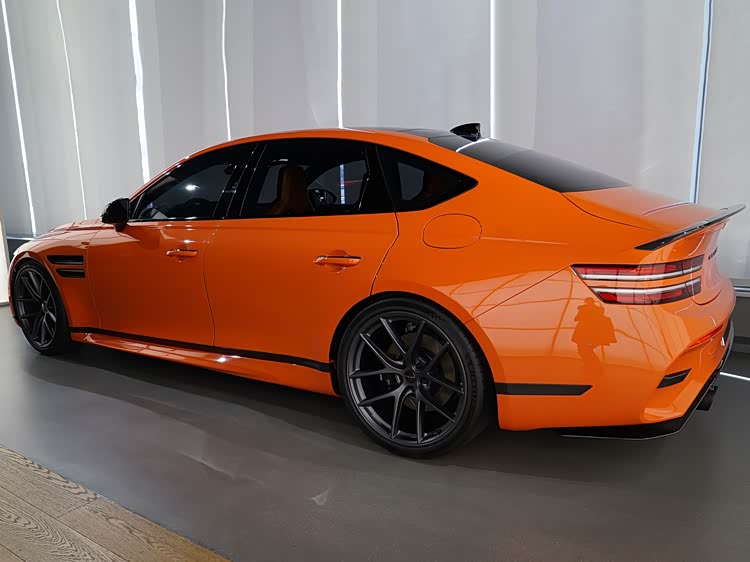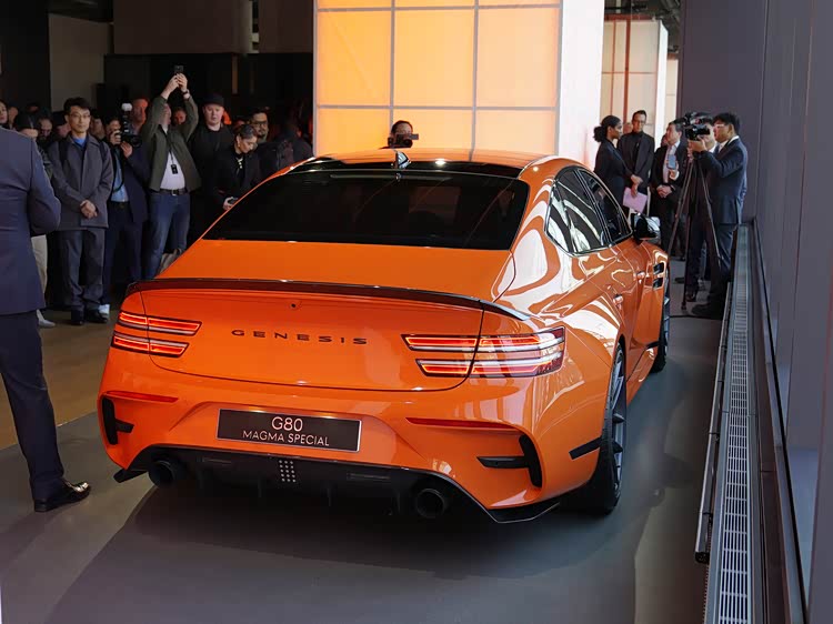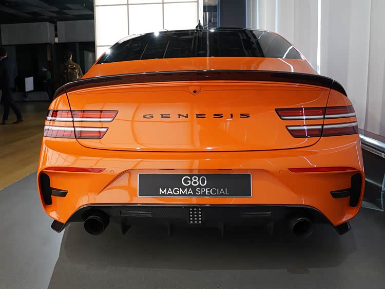 如果说车头强调功能表达,那么G80 Magma Special真正体现设计重心的位置,在于车身侧后方。前后翼子板均采用明显的宽体处理,使整车轮距在视觉与实际结构上均得到拓展。这种宽体并非单纯为了造型,而是为更宽尺寸的轮胎与更高横向抓地力提供基础条件。21英寸双五辐轻量化轮圈搭配高性能取向的轮胎规格,在提升抓地力的同时,也兼顾了制动系统散热需求。橙色车身涂装与黑色外后视镜、窗框及装饰件形成强烈对比,使车身线条更加清晰,进一步强化中大型轿车特有的修长比例。