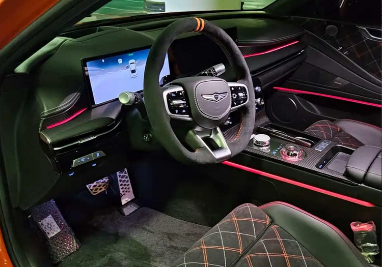 进入车内,G80 Magma Special并未沿用标准G80的豪华取向,而是通过材料与配色变化,明确区分其性能身份。方向盘上的橙色回正标识,强化了驾驶者在激烈操控中的方向判断。座椅采用Recaro性能座椅,提供更高的侧向支撑与身体固定效果,适配高加速与高速过弯场景。Alcantara面料被大量应用于座舱触点区域,配合碳纤维饰板,使内饰在触感与视觉层面都更偏向性能车属性。橙色缝线与点缀元素并非装饰堆砌,而是作为驾驶氛围的一部分,强化车辆的运动属性识别。