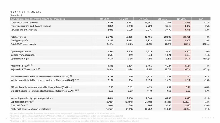 特斯拉这次如此大胆的战略调整,背后是汽车业务增长遇到瓶颈。2025年的财报数据显示,特斯拉实现营收约967亿美元,同比下滑3%,这是特斯拉史上首次年度营收下滑。GAAP净利润约38亿美元,同比下降约46%,创下近5年的最低纪录。