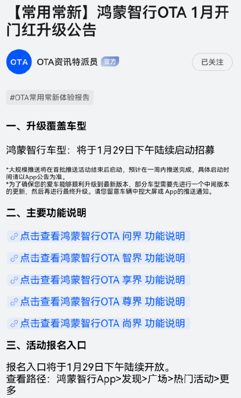 2026年1月29日,鸿蒙智行正式官宣问界系列1月开门红版本OTA升级招募将于今日下午启动。