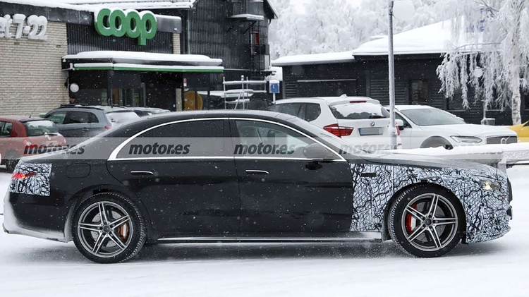 从外观来看,此次曝光的测试车伪装覆盖已经大幅减少,整体轮廓与现款车型差异并不显著。前脸部分依旧保持了AMG车型典型的设计语言,大尺寸的直瀑式进气格栅占据视觉中心,下方进气口的造型也仍然显得十分宽大。头灯组内部光源结构有所更新,从轮廓判断,预计会与新款S级轿车一样,采用以三叉星徽为灵感的点亮样式。车辆侧面装配了21英寸轮圈,并搭配红色涂装的制动卡钳。车尾部分,尾灯内部同样预计调整为星徽光效,后包围两侧则保留了AMG标志性的方形双边共四出排气尾管,并在细节处镶嵌了“AMG”标识。