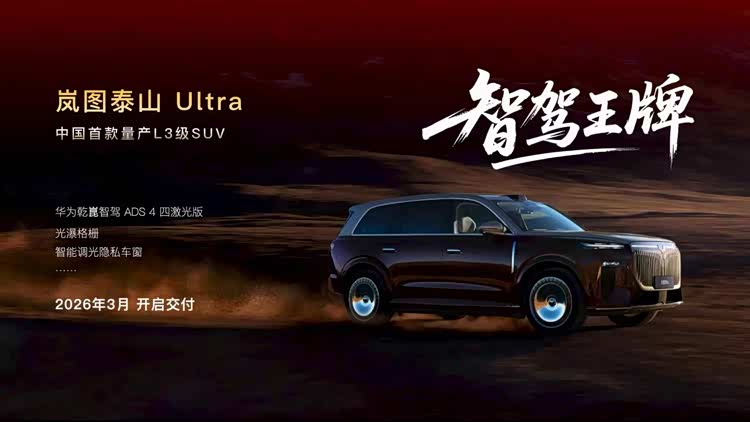 打头阵的是 岚图泰山(参数|询价)Ultra,定位于“中国首款量产L3级SUV”。它搭载了华为乾崑智驾ADS 4四激光雷达解决方案,计划于2026年3月开启交付,是岚图抢占智能驾驶技术高地的先行者。