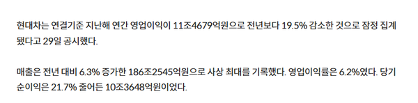 车家号·0浏览·2026-01-29 16:08 · 北京【CNMO科技消息】1月29日,CNMO注意到,据韩国媒体报道,现代汽车公布了按照合并基准计算的去年全年业绩初步统计数据。数据显示,尽管现代汽车在去年取得了历史最高营收,但营业利润却出现了接近20%的显著下滑。