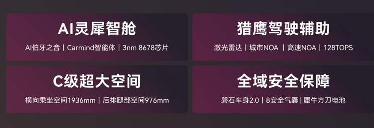 内饰也有深蓝、棕色、白/紫多种风格,简洁、多层次感的环抱式座舱内配备悬浮式中控大屏和内嵌式仪表屏,并搭载3nm 8678芯片加持的AI灵犀智舱,拥有Carmind智能体。