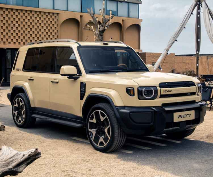 iCAR V27定位是中大型SUV,车辆采用了颇为硬朗的“方盒子”设计风格,高颜值将成为这款车的一大卖点,提供外挂式备胎、外挂式储物盒两种版本可选,其中备胎版车长5055mm,轴距达到了2910mm,匹配1.5T增程器+电机,四驱版本最大功率335kW,零百加速5秒级,CLTC纯电续航可达210km。