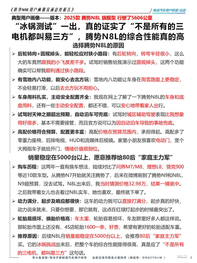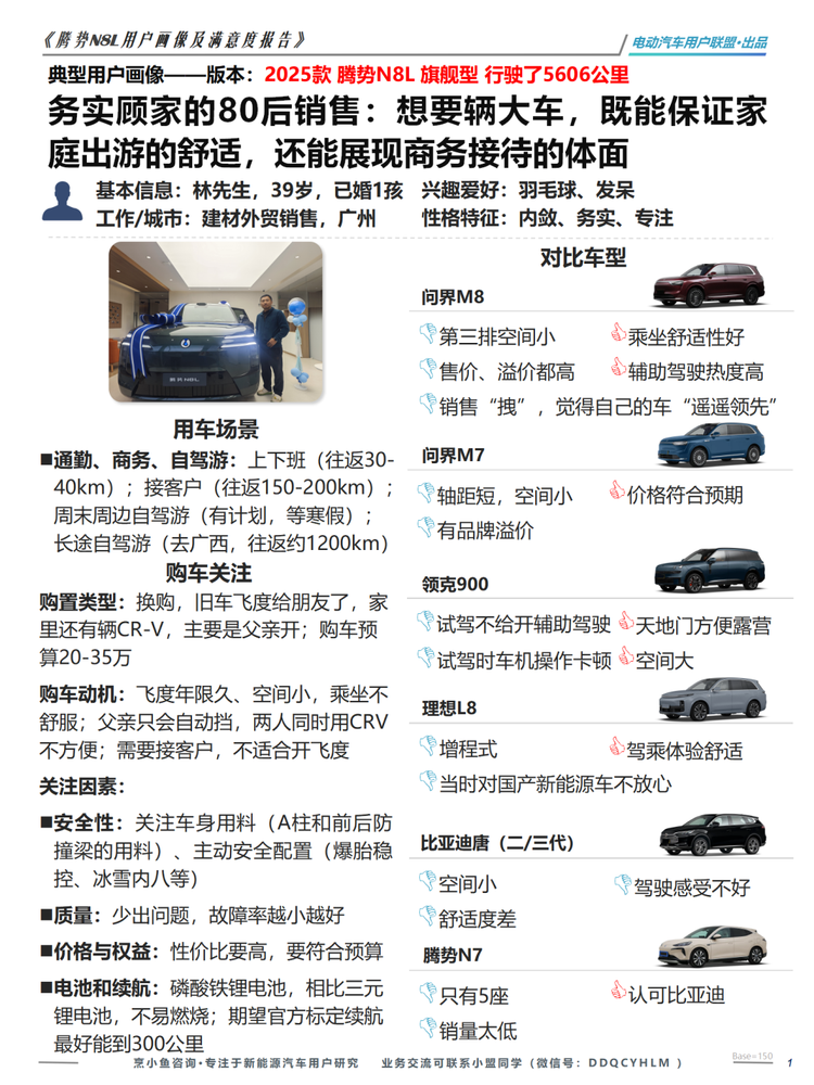 如果后续腾势N8L的月销量能稳定在5000台以上,我会推荐身边的亲戚朋友也买这辆车,特别是80后“家庭主力军”,因为这车的安全性和易三方相关功能都很亮眼,辅助驾驶也远比想象的好。我看车友群里也是80后和90年左右的车友居多,30-45岁之间,家里都有1-2个小孩。其中有部分是BBA老车主,还有部分像我一样不太在意品牌啥的,更关注配置和安全性。