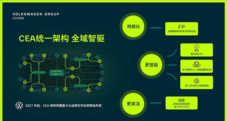 CEA架构采用区域控制的整体设计思路,配备了高性能的中央计算平台,在可扩展性与持续迭代能力上具备相应基础。该架构由大众汽车(中国)科技有限公司、CARIAD中国以及小鹏汽车共同参与研发。未来,基于CEA架构开发的车型产品线计划从A级车覆盖至B级车领域。