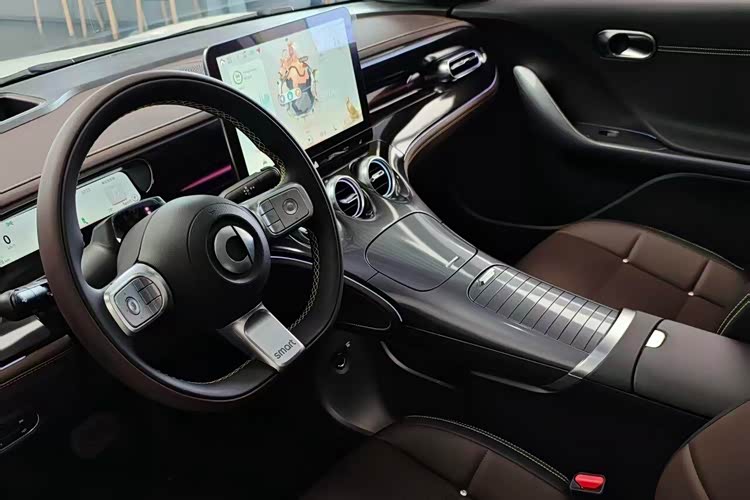 内饰采用“T型灵动智能座舱”布局,圆形空调出风口是其标志性设计。配备12.8英寸中控屏,搭载“灵感星球”smart OS全场景数字生态车机系统。车机芯片采用高通骁龙8155,以保障操作流畅度。