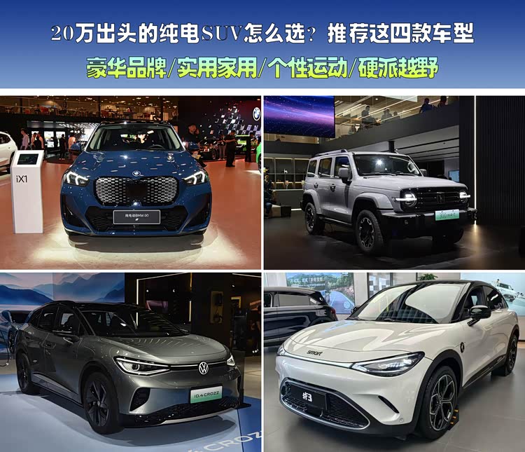 在20万出头的购车预算下,新能源SUV应该怎么选?今天为大家推荐四款车型,分别是宝马iX1、 ID.4 CROZZ(参数|询价)、smart精灵#3以及坦克300新能源。