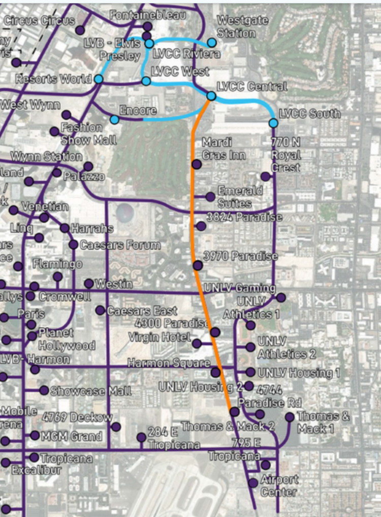 该路段是完善整个网络布局的重要一环,其隧道将沿天堂路(Paradise Road)地下铺设,形成连接会议中心与机场的新通道,并计划在热带大道(Tropicana Avenue)北侧增设站点。
