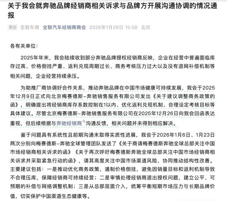 针对这一情况,全联车商已分别于2025年12月9日、2026年1月6日、1月23日三次分别向北京梅赛德斯-奔驰销售服务有限公司、梅赛德斯-奔驰全球管理团队发送了《关于建议调整商务政策的函》《关于商请梅赛德斯奔驰全球总部关注中国市场经销商相关诉求的函》《关于再次呼吁梅赛德斯奔驰全球总部关注中国市场经销商相关诉求并采取紧急行动的函》,请其高度关注中国市场渠道风险,协同推动结构性改善。