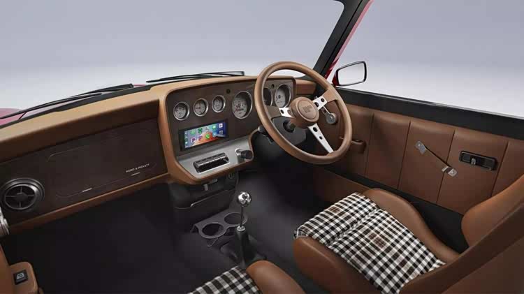 内饰以温暖的棕褐色Bridge of Weir 皮革为主,仪表盘采用木质饰板,灵感源自该公司20世纪60年代生产的Margrave Mini车型上的胡桃木面板,同时搭配格子面料的座椅,形成复古和时尚完美搭配。