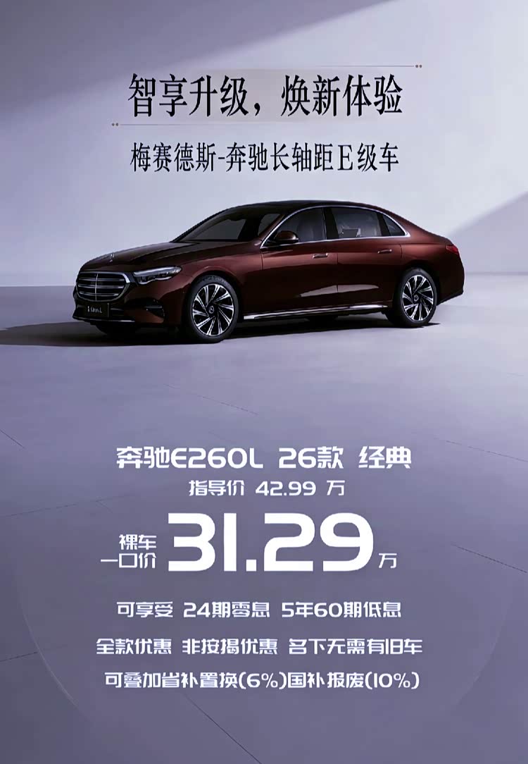 奔驰E260L,一口价31.29万。