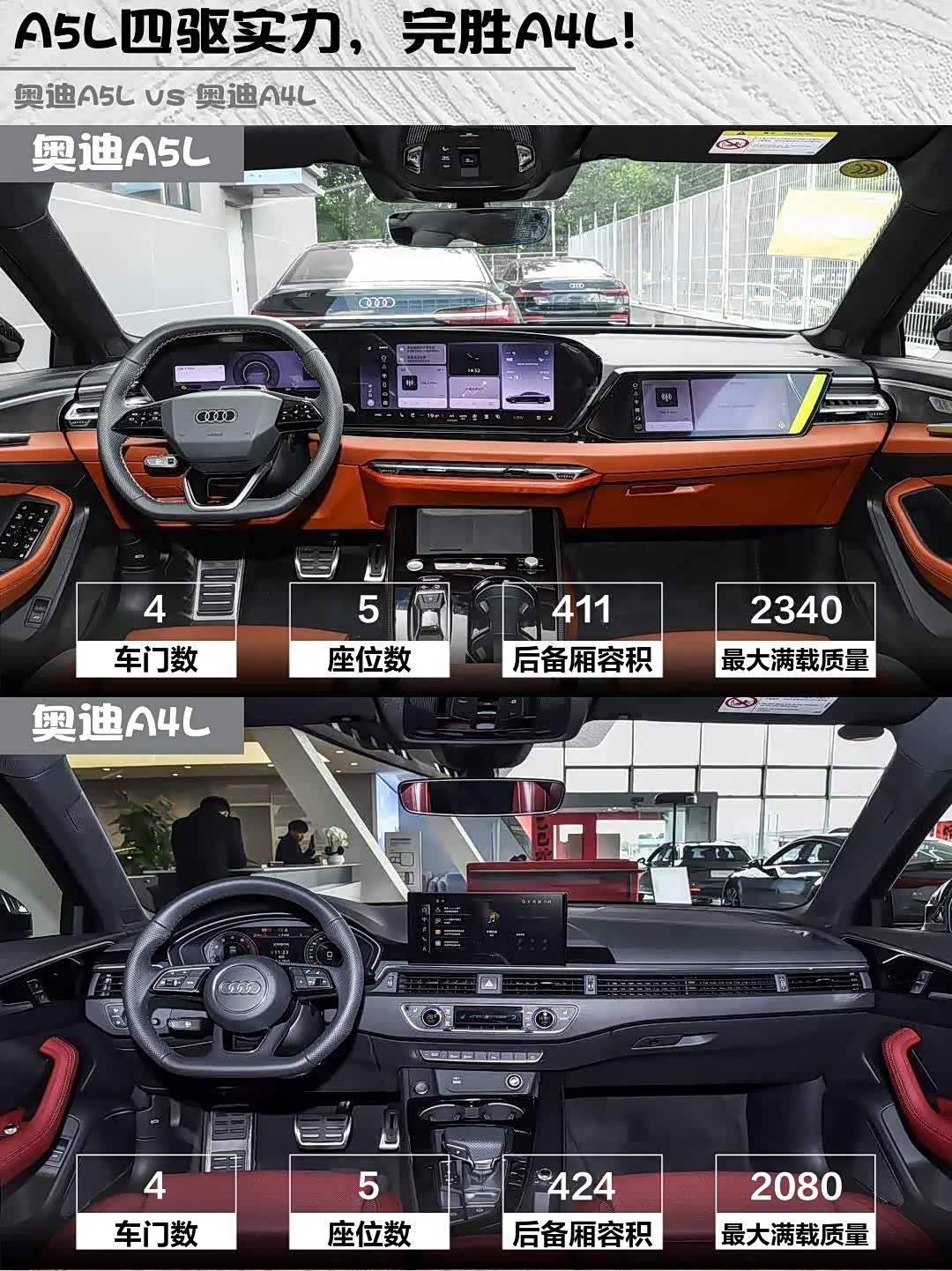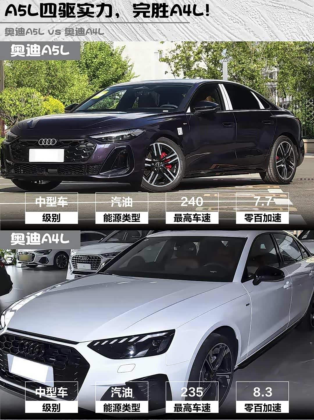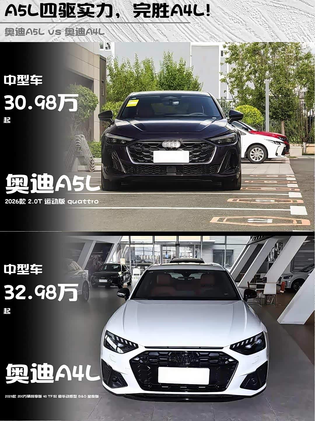 A5L运动版指导价30.98万,终端能谈到25万左右;A4L星夜版32.98万但优惠更大。算上选装件的话,两车实际落地价差不超过2万,关键看你要颜值还是要性价比💰