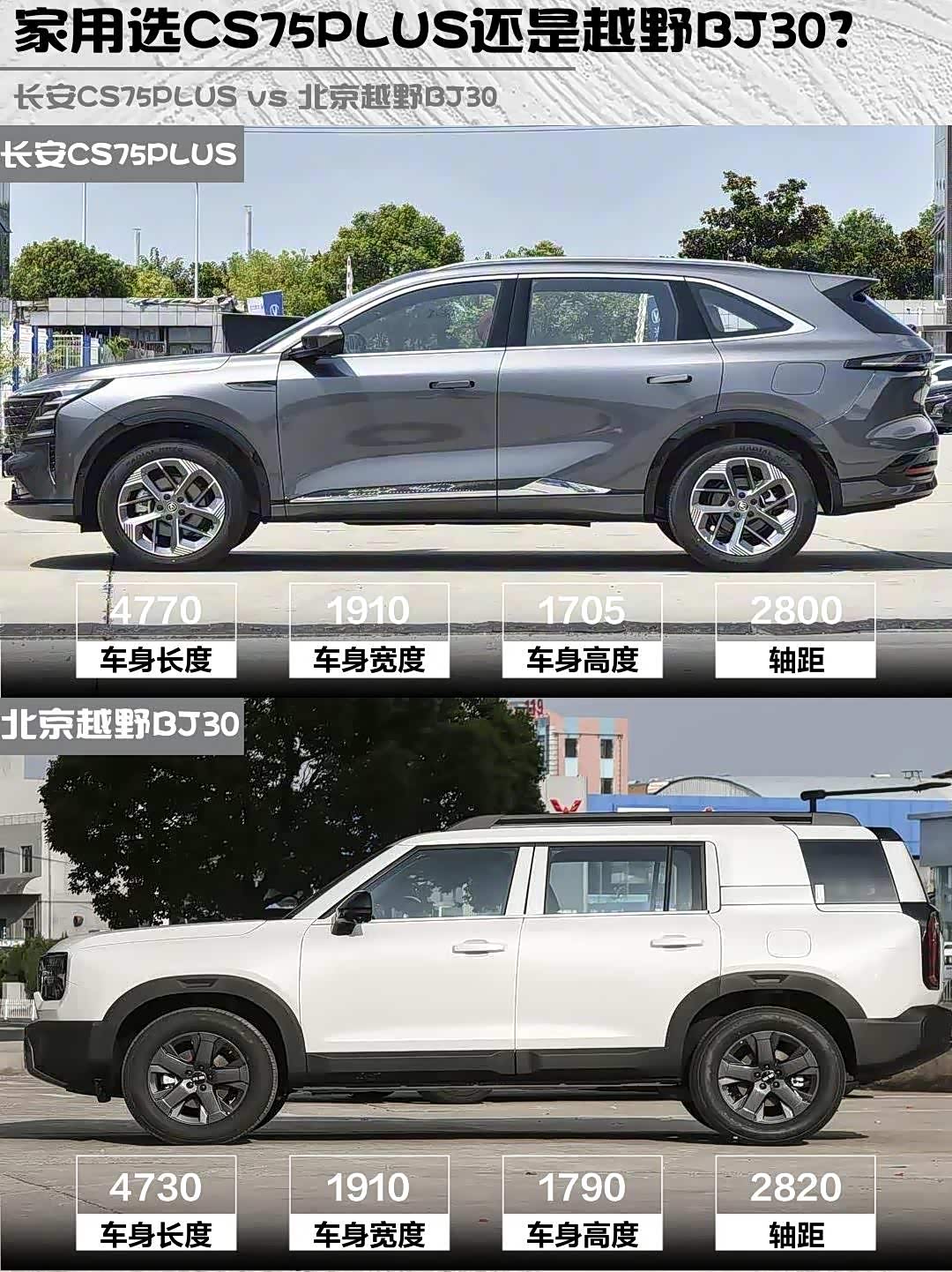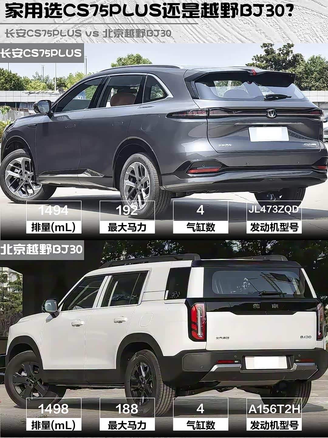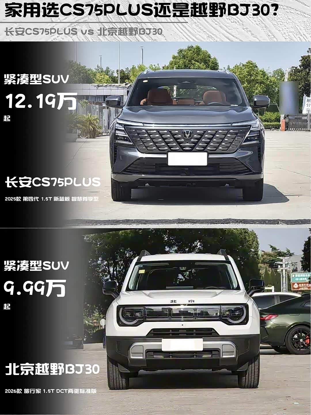 最近在选车的小伙伴看过来!今天给大家深度对比两款热门SUV—— 长安CS75PLUS(参数|询价) 2025款 第四代 1.5T 新蓝鲸 智慧尊享型 vs 北京越野BJ30 2026款 旅行家 1.5T DCT两驱标准版,实测干货分享来咯!🔥