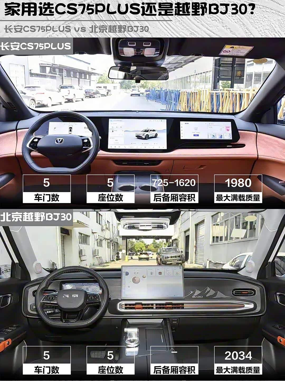 CS75PLUS后排能跷二郎腿,后备箱725L容积装婴儿车+露营装备无压力,座椅放倒直接变1.8米大床🛏️。BJ30头部空间更充裕(1790mm车高),但后备箱规整度稍逊。重点吐槽:CS75PLUS引擎盖居然没液压杆!女生加玻璃水要练臂力💪
