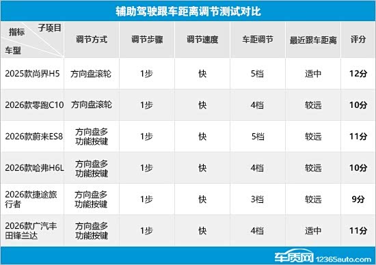 在辅助驾驶跟车距离调节测试对比中,6款车型的调节步骤均为1步,且调节速度表现出色。不过在车距调节方面,尚界H5和蔚来ES8支持5档车距调节,档位较多,而捷途旅行者则表现一般,仅支持3档车距调节。此外,在最近跟车距离方面,零跑C10、蔚来ES8、哈弗H6L和捷途旅行者的测试成绩均不太理想。
