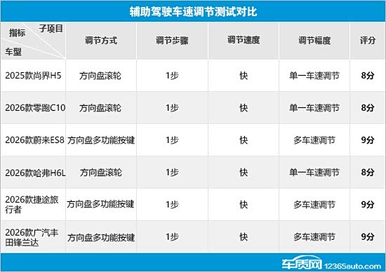 在辅助驾驶车速调节测试对比中,6款车型的整体表现符合预期。虽然调节方式存在差异,但在调节步骤和调节速度方面均表现一致。而在调节幅度方面,尚界H5、零跑C10和哈弗H6L不支持多车速调节,因此出现失分情况。