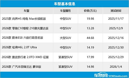 本期选取的6款车型包括3款中型SUV、2款紧凑型SUV和1款大型SUV,涵盖自主和合资品牌,包含燃油车和新能源车。
