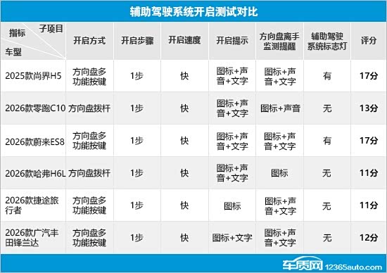 在辅助驾驶系统开启测试对比中,2026款零跑C10(以下简称:零跑C10)和2026款哈弗H6L(以下简称:哈弗H6L)采用方向盘拨杆开启,其余车型均为方向盘多功能按键开启。开启步骤方面,6款车型均只需1步,并且开启速度快,日常使用便捷。开启提示方面,除了2026款捷途旅行者(以下简称:捷途旅行者)和2026款广汽丰田锋兰达(以下简称:丰田锋兰达)之外,其余车型均为三种提示方式。此外,6款车型均配备方向盘离手监测提醒功能,2025款尚界H5(以下简称:尚界H5)、2026款蔚来ES8(以下简称:蔚来ES8)、捷途旅行者和丰田锋兰达均提供图标、声音和文字提示,表现出色。值得一提的是,尚界H5和蔚来ES8还配备了辅助驾驶系统标志灯,能够为其他道路参与者提供明显提示。