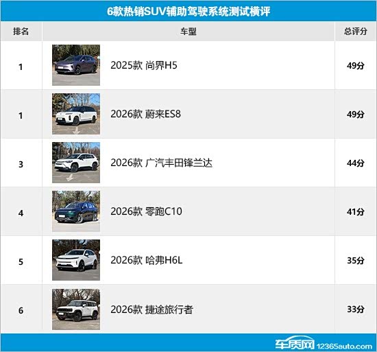 通过此次横评可以发现,尚界H5和蔚来ES8凭借辅助驾驶系统开启测试中的出色表现,结合多项测试中的满分成绩,总评分均达到49分,并列排名第一;丰田锋兰达表现同样可圈可点,以44分的成绩紧随其后;零跑C10虽然在不同测试环节存在丢分情况,不过最终评分也达到40分以上,成绩基本令人满意。至于哈弗H6L和捷途旅行者,由于在跟车状态测试中存在明显减分情况,导致最终评分分别为35分和33分,排名靠后。当然,参与横评的6款车型在辅助驾驶系统测试中或多或少都存在一些问题,希望厂家在后续的车型升级中持续优化改进,为车主带来更加安全便捷的辅助驾驶体验。