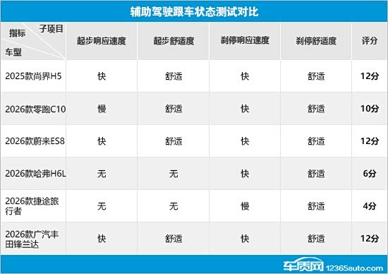 在辅助驾驶跟车状态测试对比中,尚界H5、蔚来ES8和丰田锋兰达均获得满分,起步和刹停过程中的响应速度和舒适度都能令人满意。零跑C10的失分原因在于起步阶段响应速度较慢,哈弗H6L和捷途旅行者则由于不支持自动跟车起步功能,因此在起步响应速度和起步舒适度两项未获得分数。