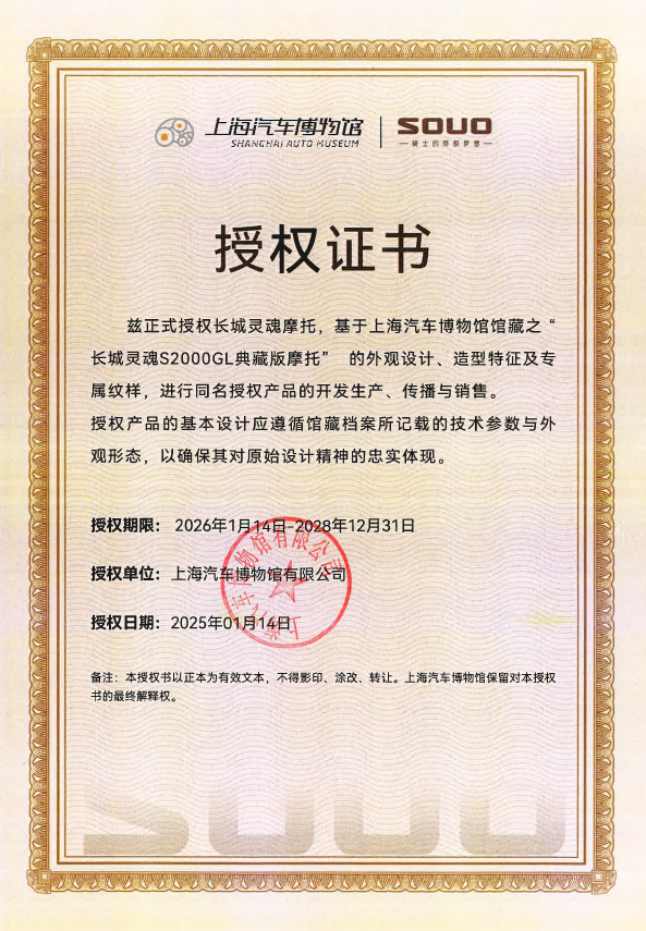 长城灵魂S2000GL典藏版创造了中国摩托车产业的诸多历史。它是首款被上海汽车博物馆收藏的国产高端重机摩托车,搭载的八缸八挡动力总成打破了全球高端摩托车动力天花板,也是长城灵魂达成“打造一台载入史册的摩托车”的里程碑之作。可以说,长城灵魂S2000GL典藏版是中国摩托车产业从制造交通工具向创造高端骑行文化产品跨越的典型代表。