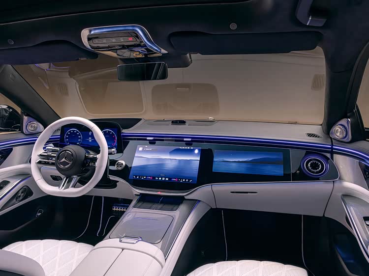 内饰部分也有较大变化,中控屏和副驾屏的组合形式和现款E级类似,取消了原先的竖向放置的设计,更有一体感。14.4英寸中控屏内置最新的MBUX智能人机交互系统,且整合了较多的AI技术。副驾娱乐屏尺寸达到12.3英寸,可以看视频听音乐等。功能方面,作为旗舰,自然也是比较丰富的,两个手机无线充电位置、座椅按摩、可加热安全带等等都有,后排还会配备显示屏和车载冰箱等。