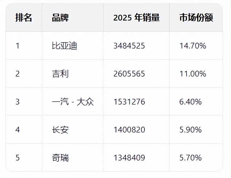 中国乘用车市场信息联席会(CPCA)数据显示,比亚迪以 3484525 辆的全年销量,继续稳坐中国市场车企零售销量榜首;吉利以 2605565 辆的销量位居第二,较上一年同比大幅增长 47%。