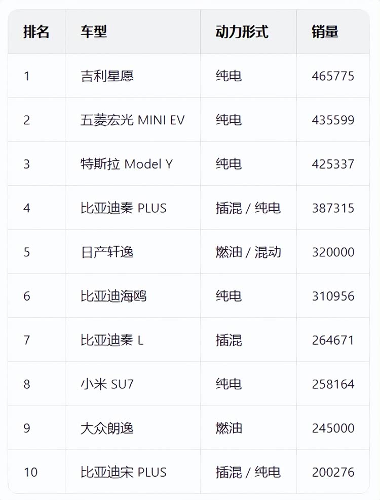 近日,外媒热议2025年中国十大畅销车型,只有三款来自外国汽车制造商。文中称,2025年中国乘用车销量放榜,结果让不少人眼碎一地:年度单车销冠不是特斯拉Model Y,也不是比亚迪秦,而是名不见经传的吉利 星愿(参数|询价)——一款车长仅4.1米的纯电两厢小车。2025年吉利星愿注册量达 465775 辆,正式终结了特斯拉 Model Y 连续两年的销冠统治。