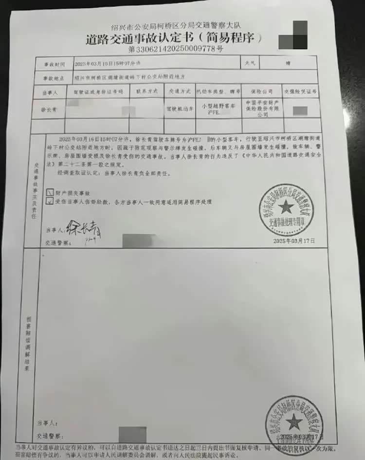根据多家媒体披露的信息,事情要追溯到去年3月16日。当天,一辆汽车在浙江绍兴柯桥区撞上路边围墙,车辆受损但未造成人员伤亡。