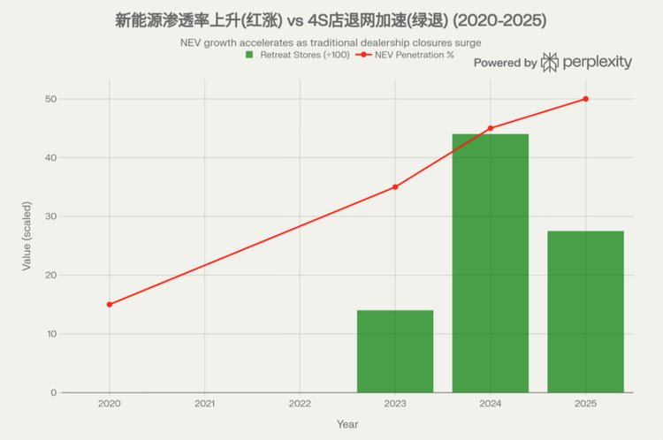 真正的拐点,集中在2023到2025年。新能源价格战打到最凶的这两年,闭店、退网成了行业高频词。2024年一年,全国退网4S店超过4400家,渠道总量降到约3.3万家,行业第一次从“增量扩张”切换到“存量淘汰”。