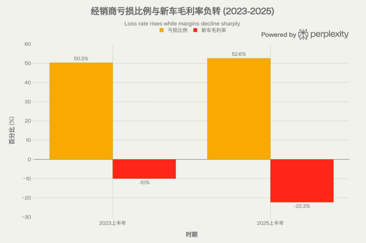 先看最直观的卖车。截至到目前可查的确切数据,2025年上半年,全国经销商亏损比例已经超过一半,新车业务整体毛利率被测算为负值。有行业报告给出的区间是,新车毛利率大约在-20%左右,超过七成经销商存在价格倒挂,其中不少倒挂幅度超过15%。