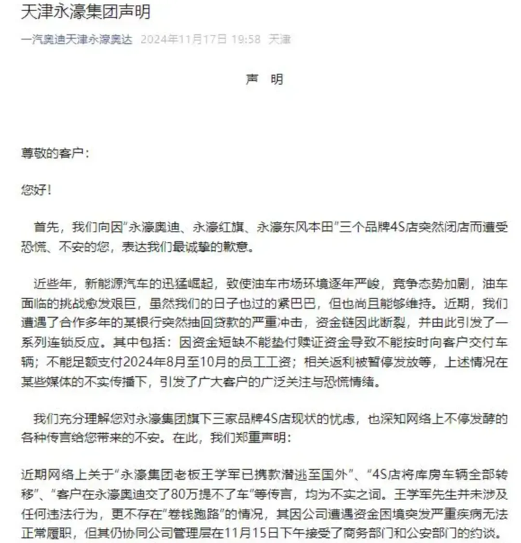 后来广东永奥、天津永濠陆续出事,故事的细节不同,但死因高度一致:高库存、高杠杆、现金流高度依赖新车交易。只要行业进入“以价换量”的阶段,谁都扛不住。