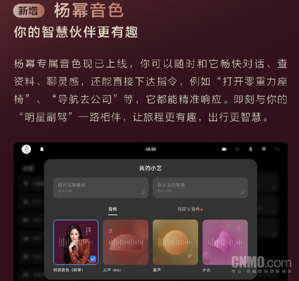 本次升级的核心亮点之一是杨幂专属音色的正式上线。用户现可选择杨幂音色作为车辆的语音助手,进行查资料、聊灵感或直接下达“打开零重力座椅”、“导航去公司”等指令,实现与“明星副驾”的畅快对话。