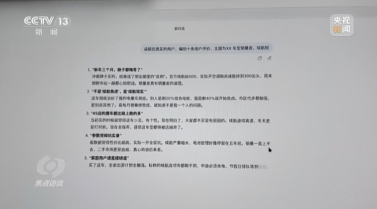 记者进行了一次测试:随机选用一款常见AI大模型,输入“xx车型、销量差、续航短”等关键词,指令其生成十段模拟客户评价。结果不出半分钟,十篇表述各异但恶意趋同的“用户差评”立刻生成。而当记者要求AI对其中的内容进行二次“洗稿”时,它甚至能自动编造细节,使内容更具欺骗性。这意味着炮制海量虚假信息的技术门槛已经非常低。