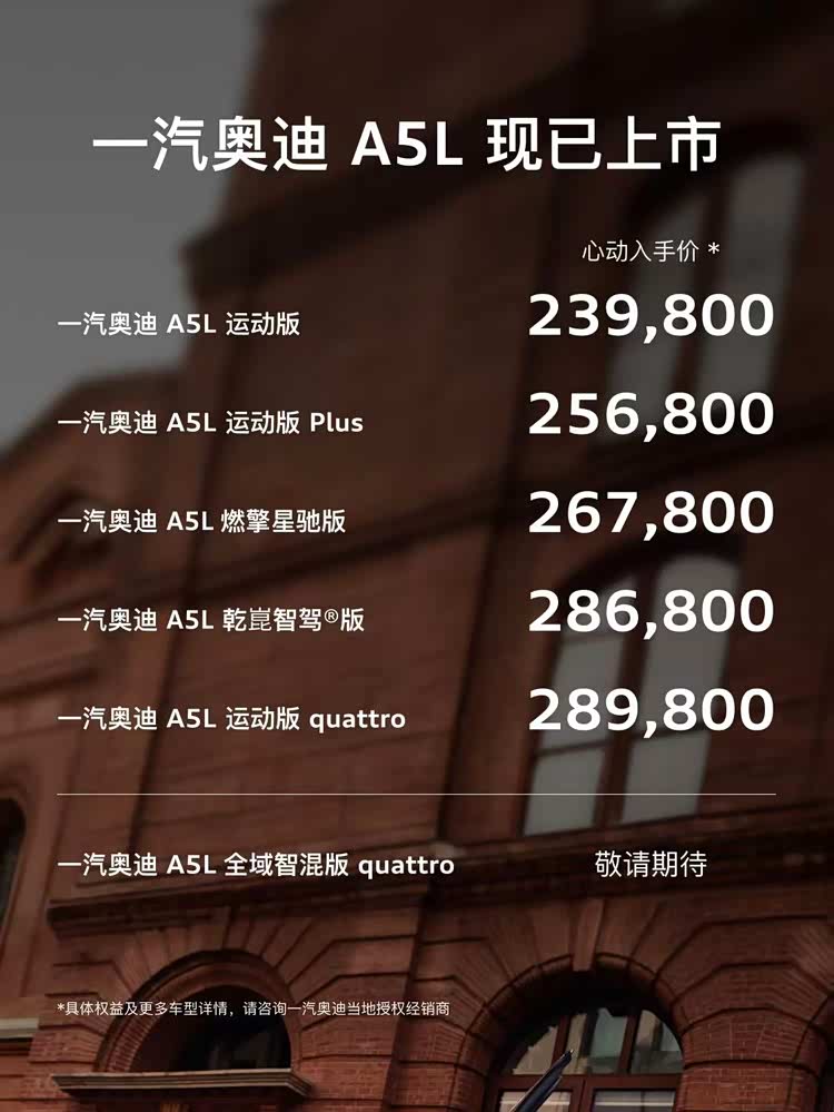 一汽奥迪A5L可以视为奥迪A4L的新一代车型,于2025年8月首次上市,目前官方指导价格区间为25.58万-30.98万元,心动入手价23.98万-28.98万元。从定价角度来看,本次新增的燃擎星驰版属于一汽奥迪A5L的中配版本。