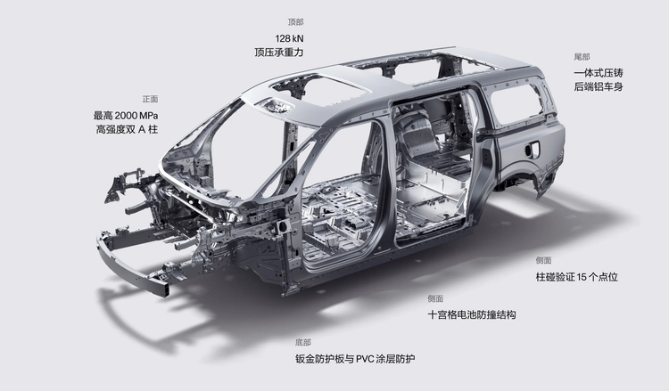 其车身采用了2000MPa的热成型钢,再加上一体式压铸后端铝车身和三车唯一采用的双A柱设计,共同构建了一个720°全方位安全盔甲。同时官方信息显示,它是早在2024年,全球首个成功通过“MPV连环追尾试验”的车型,并且在侧面碰撞测试中进行了多达15个点位的验证,这些都超出了常规行业测试标准。