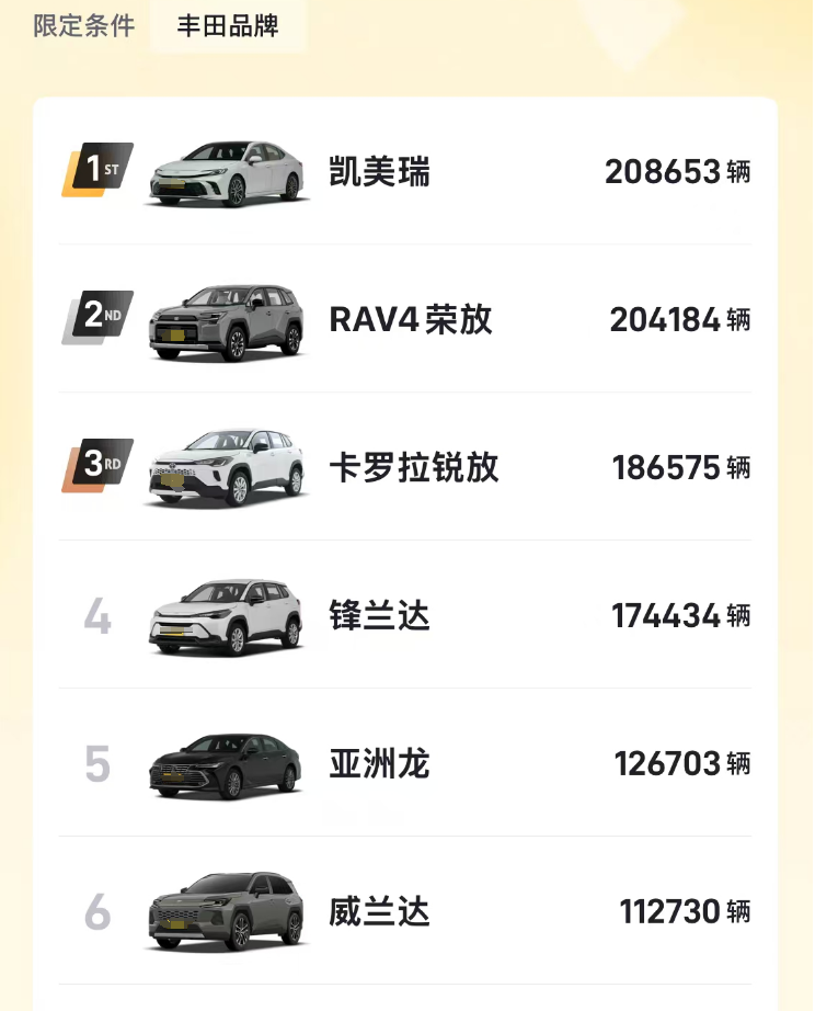二是产品矩阵够扎实,入门级的锋兰达和卡罗拉锐放,合计卖了33万多辆,终端价下探到10万内,走量能力超强,而RAV4荣放、凯美瑞这些经典车型,月销稳定,年销超20万辆,守住了基本盘。