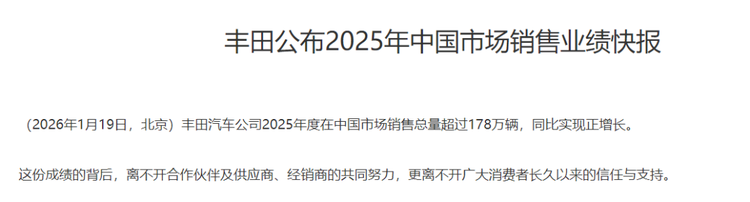 先看核心数据,好记又直观:2025年丰田中国(含雷克萨斯)全年总销量178.4万辆,同比微增0.23%,惊喜不惊喜呢?