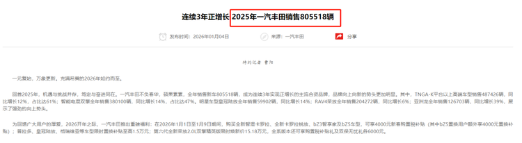 但在新能源转型加速、自主品牌崛起的大背景下,丰田接下来能不能扩大纯电市场份额、提升智能化体验,能不能守住现有份额,甚至实现突破,2026年我们拭目以待。