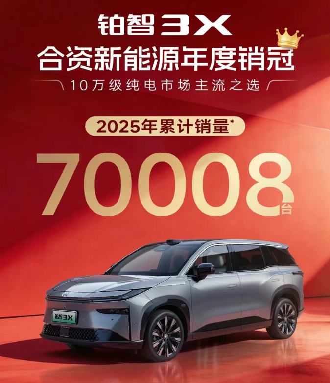 也就是说广汽丰田卖的车,一半以上都是混动版, 凯美瑞(参数|询价)混动版同比更是大涨62%,妥妥的中高级混动轿车标杆。更亮眼的是纯电领域,铂智3X这款纯电SUV,全年卖了7万多辆,直接拿下合资纯电SUV销冠,一下子补齐了丰田纯电的短板。