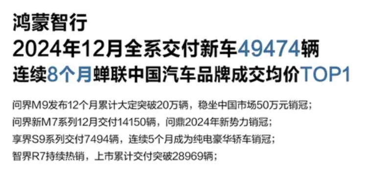 2024年,问界品牌全年销量为38.71万辆,2024年,问界品牌全年销量为444,956辆。其中, 问界M9(参数|询价)发布12个月累计大定突破20万辆,稳坐中国市场50万元销冠;问界新M7系列12月交付14150辆,问鼎2024年新势力销冠。